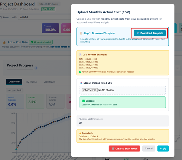Step 4: Verify Your EVM MetricsAfter uploading actual costs, refresh your dashboard and
