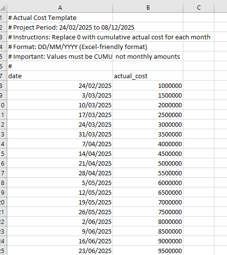 5. Save the Excel file (e.g., Project_ABC_Actual_Costs.xlsx)